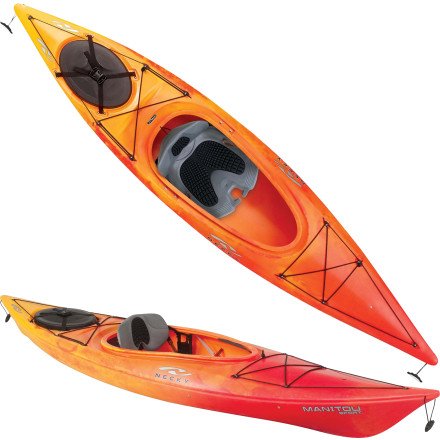 Climb into the Necky Kayaks Manitou Sport Kayak and paddle down slow-moving rivers, across open lakes, or along the ocean for some close-to-shore coastal exploration. The short length, soft chine lines, and molded-in rear skeg make this hull maneuverable in moving water and stable in rough, windy conditions, and they help it track straight for efficient paddling over long distances. Novice paddlers will appreciate the comfortable, adjustable seating, while intermediate paddlers will love the fact that there's more than 60 liters of stern storage for all sorts of extra gear.